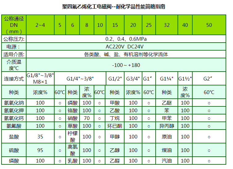 聚四氟乙烯化工電磁閥具有優(yōu)異的耐腐蝕性能,對所有的常用化學品都呈惰性。幾乎可以抵抗所有化學介質(包括濃硫酸和王水)。具有優(yōu)異的耐熱性能,應用溫度為-100~180℃,材料可長期在230~260℃下工作。特別適合腐蝕嚴重、溫度高且化學品不允許與潤滑劑接觸的環(huán)境。