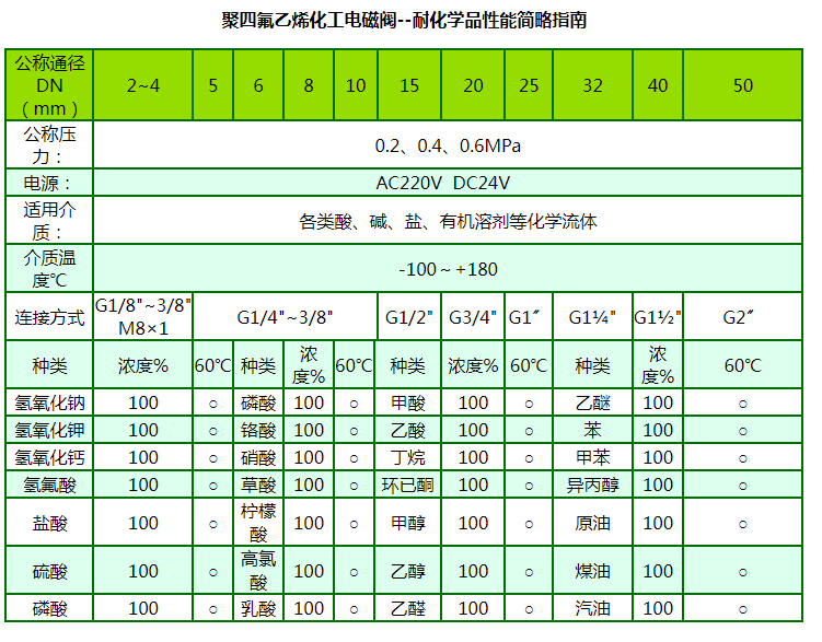 聚四氟乙烯化工電磁閥具有優(yōu)異的耐腐蝕性能,對所有的常用化學品都呈惰性。幾乎可以抵抗所有化學介質(zhì)(包括濃硫酸和王水)。具有優(yōu)異的耐熱性能,應用溫度為-100~180℃,材料可長期在230~260℃下工作。特別適合腐蝕嚴重、溫度高且化學品不允許與潤滑劑接觸的環(huán)境。