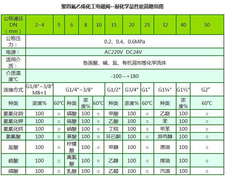 聚四氟乙烯化工電磁閥具有優(yōu)異的耐腐蝕性能,對所有的常用化學品都呈惰性。幾乎可以抵抗所有化學介質(zhì)(包括濃硫酸和王水)。具有優(yōu)異的耐熱性能,應用溫度為-100~180℃,材料可長期在230~260℃下工作。特別適合腐蝕嚴重、溫度高且化學品不允許與潤滑劑接觸的環(huán)境。
