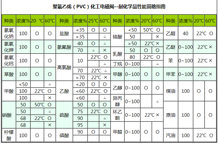 聚氯乙烯(PVC)化工電磁閥具有優(yōu)良的耐腐蝕性能,耐酸(包括稀硝酸)、堿、鹽、氣體、水等的腐蝕。對(duì)無(wú)極性的烷烴及強(qiáng)極性的羧酸、醇類(lèi)有較大的抗溶劑能力。少數(shù)氧化性酸在濃度較高時(shí)對(duì)其有較大的腐蝕作用。有一定的剛度和強(qiáng)度,適用溫度為-0~60℃。