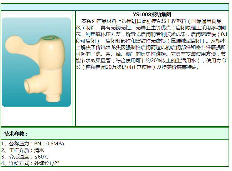 【產(chǎn)品特點】它具有安裝使用方便,節(jié)能節(jié)水效果顯著(綜合使用可節(jié)約20%以上的生活用水),使用壽命長(連續(xù)啟閉20萬次仍可正常使用)及物美價廉等特點。